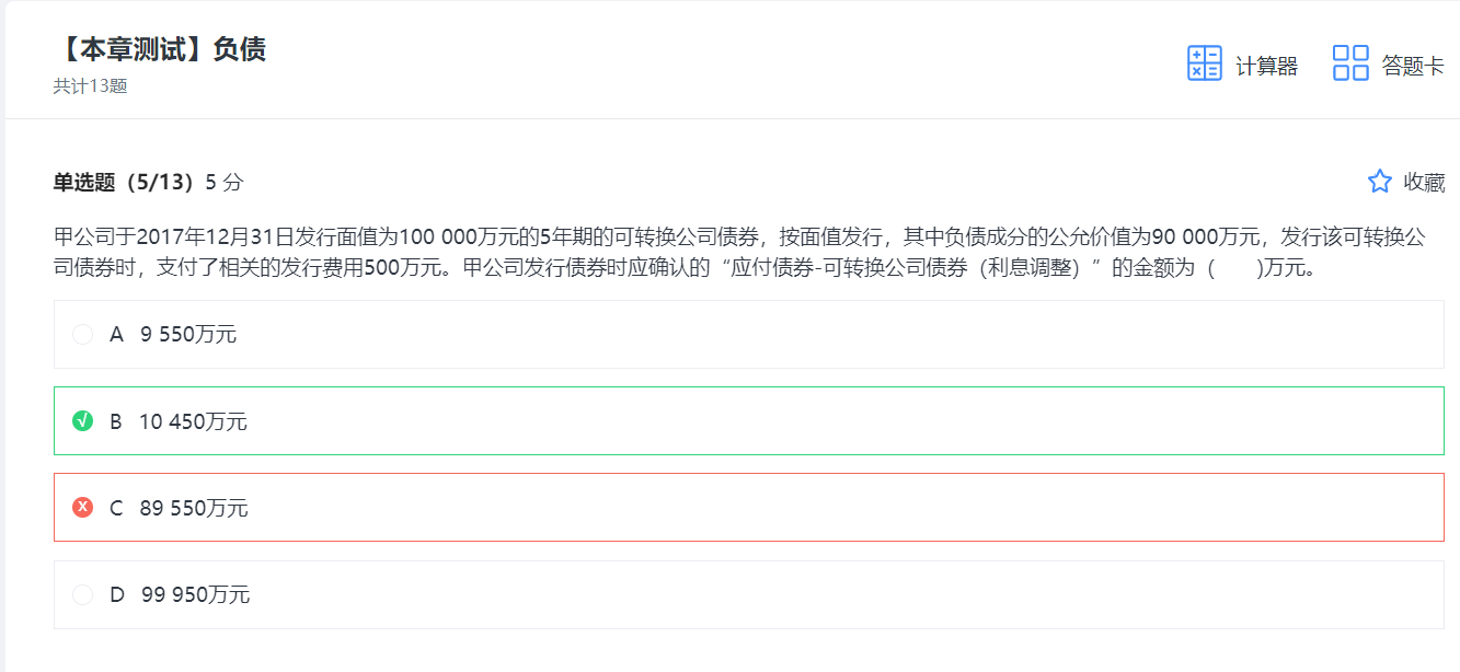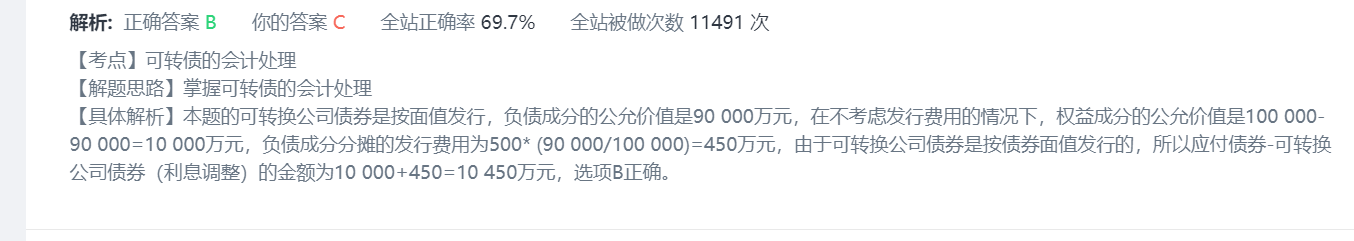 本题中可转债按面值发行,发行价100000万元,负债成分公允价值90000万元,则权益成分价值100000-90000=10000万元。另支付发行费500万元, 按负债成分、权益成分的公允价值分摊,则负债部分分摊500*90000/100000=450万元,权益成分分摊500-450=50万元。此时,负债成分账面价值90000-450=99550,权益成分账面价值10000-50=9950万元。会计分录为: