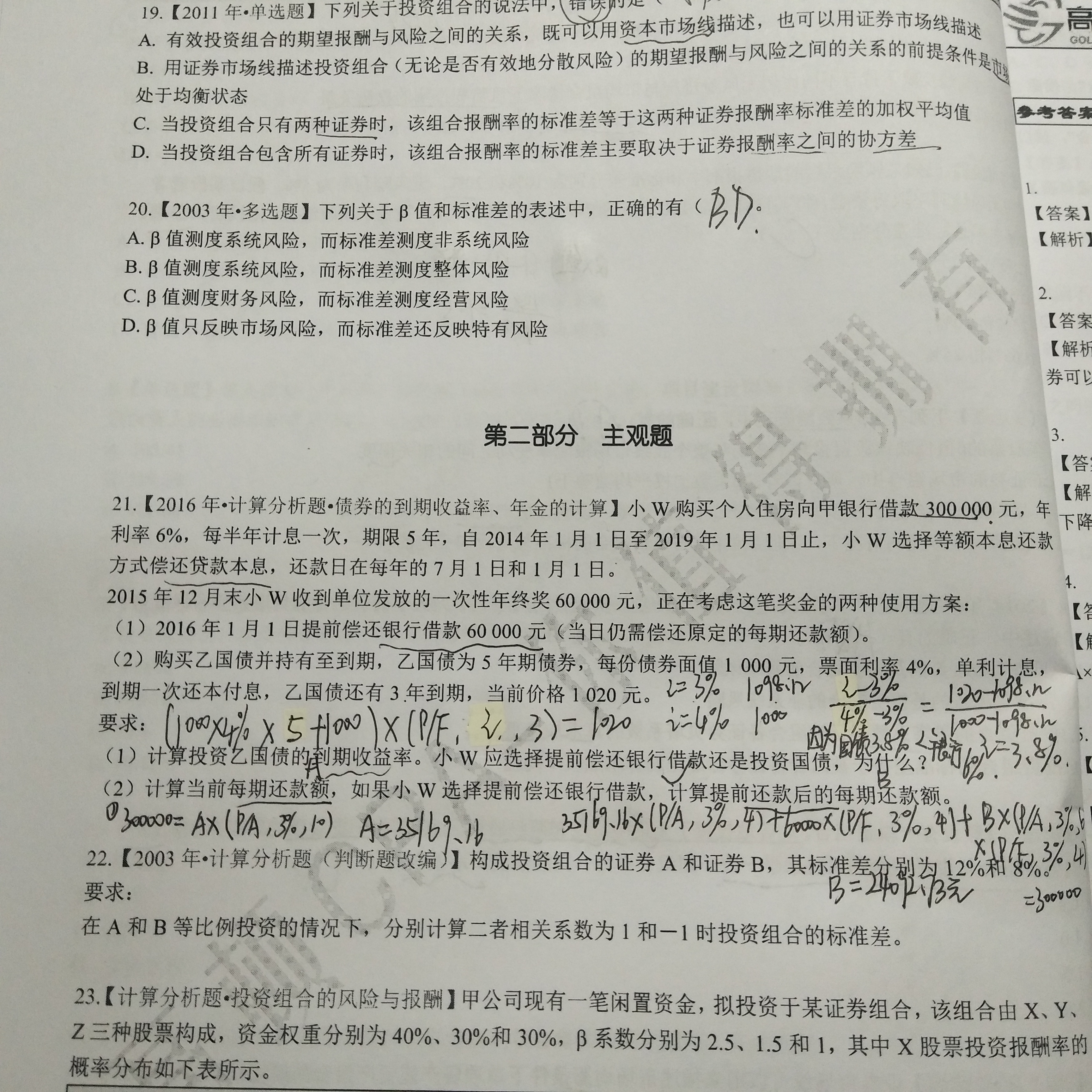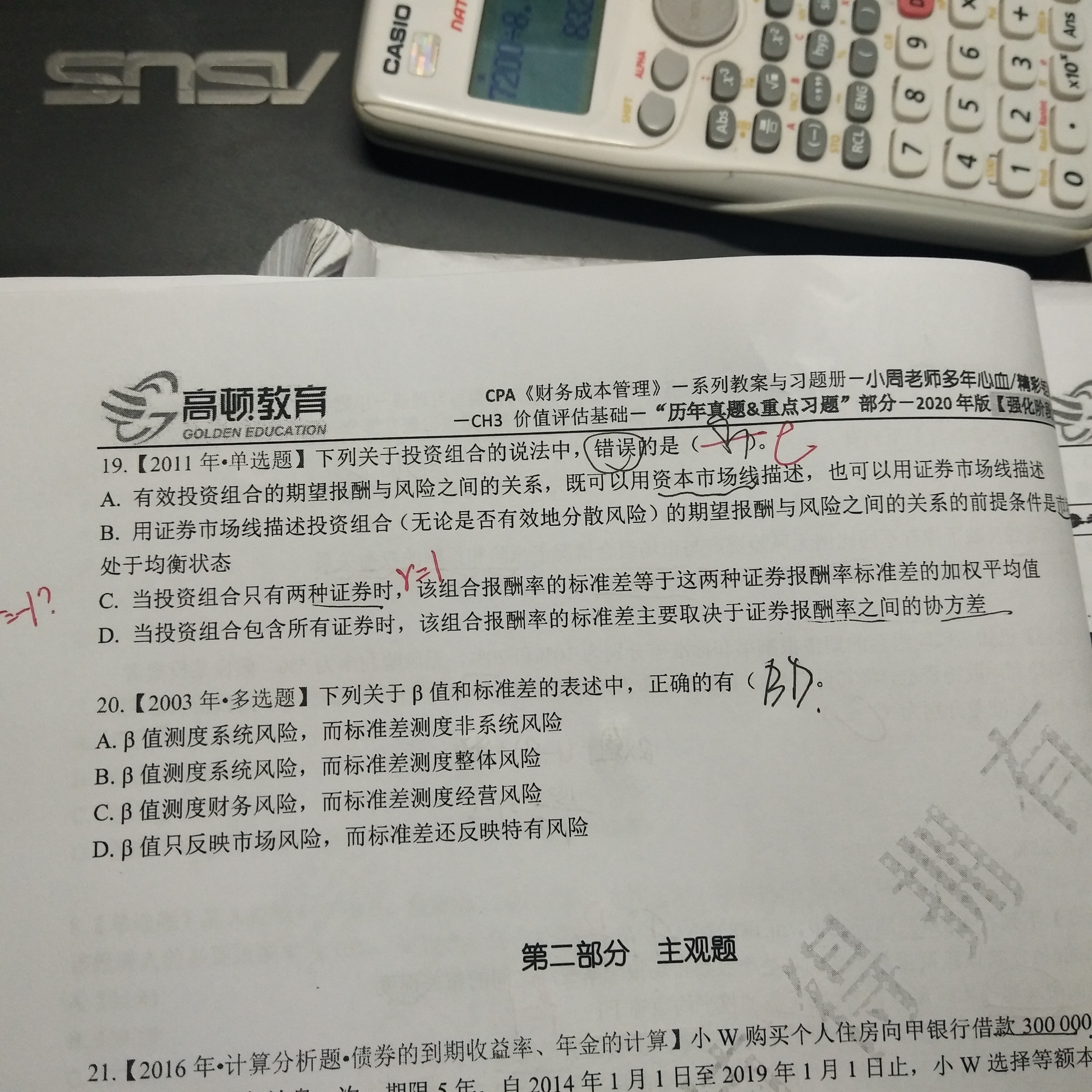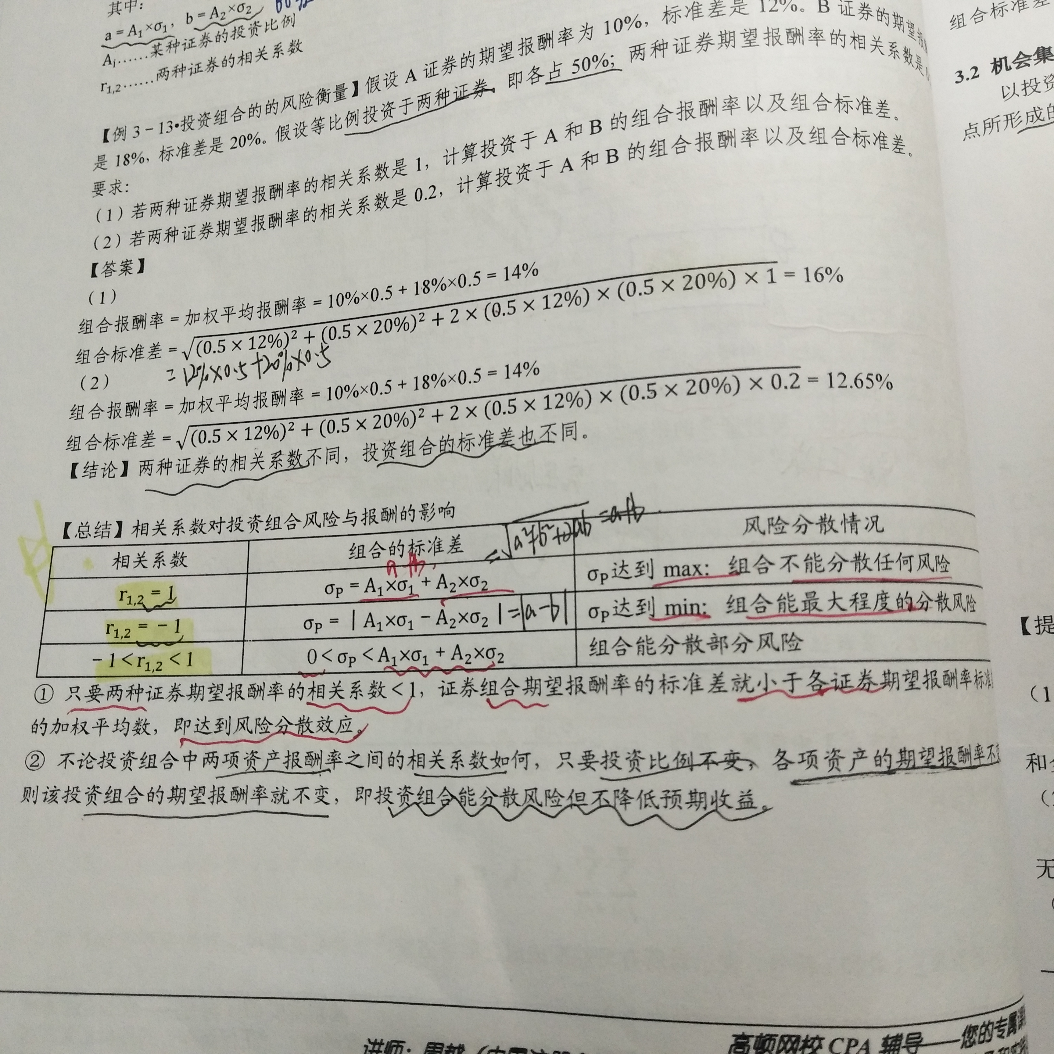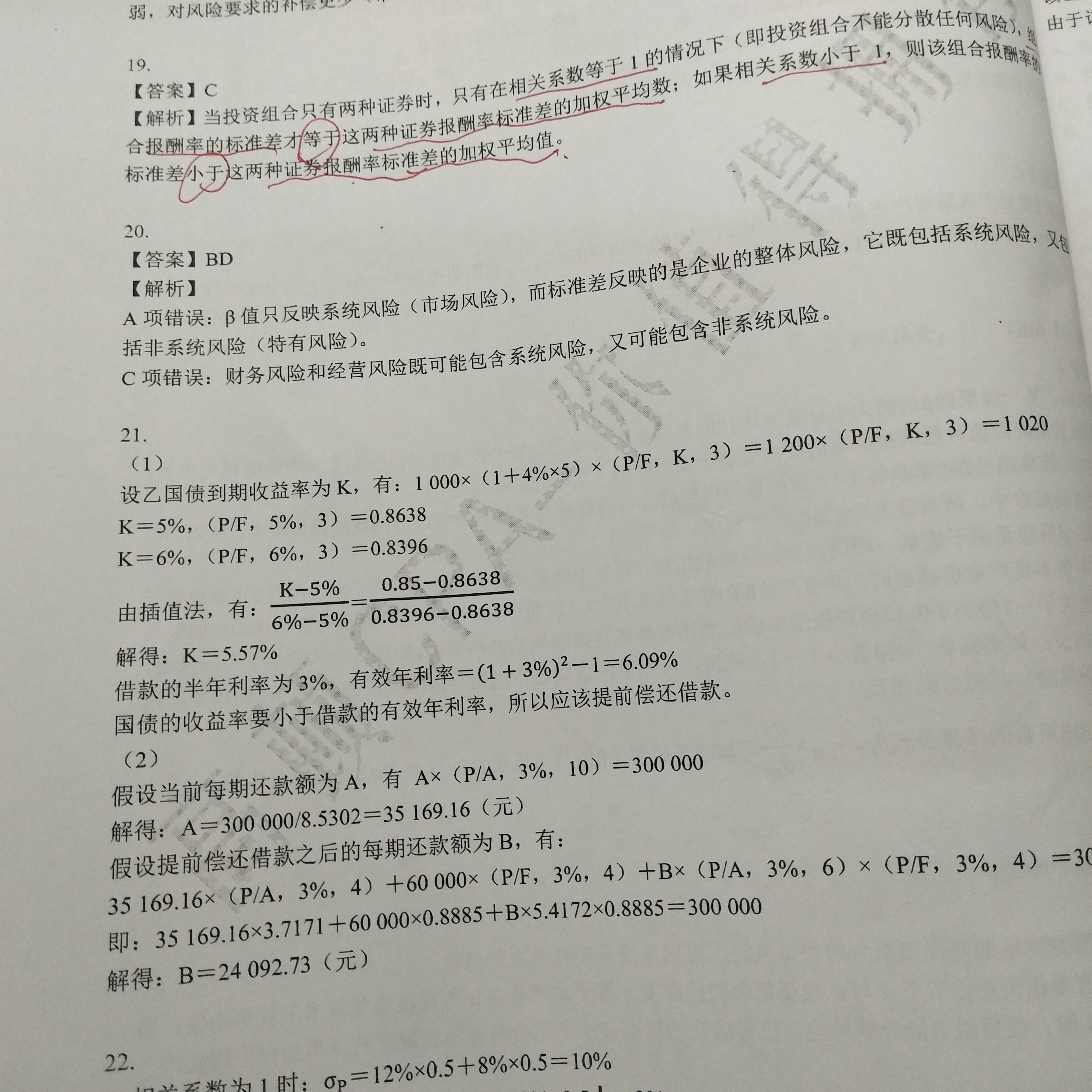 第19题C:当R=-1时,组合的标准差=|A1×标准差1-A2×标准差2|,这不是加权平均数。