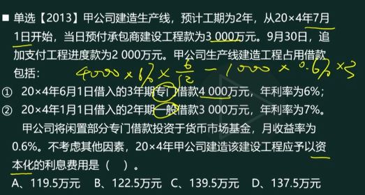 答案无误。请按照陆老师上课时思路,可以再自己计算一遍。两部分组成,专门借款资本化利息是102,一般借款资本化利息是17.5,两者相加是119.5,因此选A。