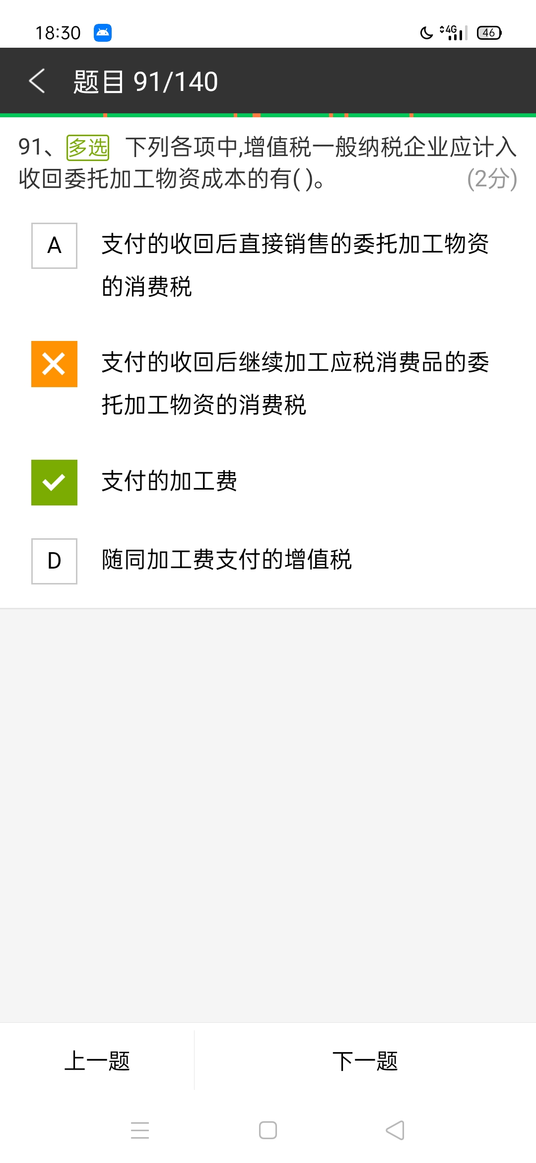 涉及的消费税则需要依照相关消费税法规的要求视收回后的应税消费品是否继续加工,如继续加工,发生的受托方代收代缴消费税税额可以用于再加工产生消费税计税的扣除,单独确认在应交消费税借方登记。如不再加工直接出售此时代收代缴消费税税额计入成本。因此,A选项应当选择。B选项不该选择。