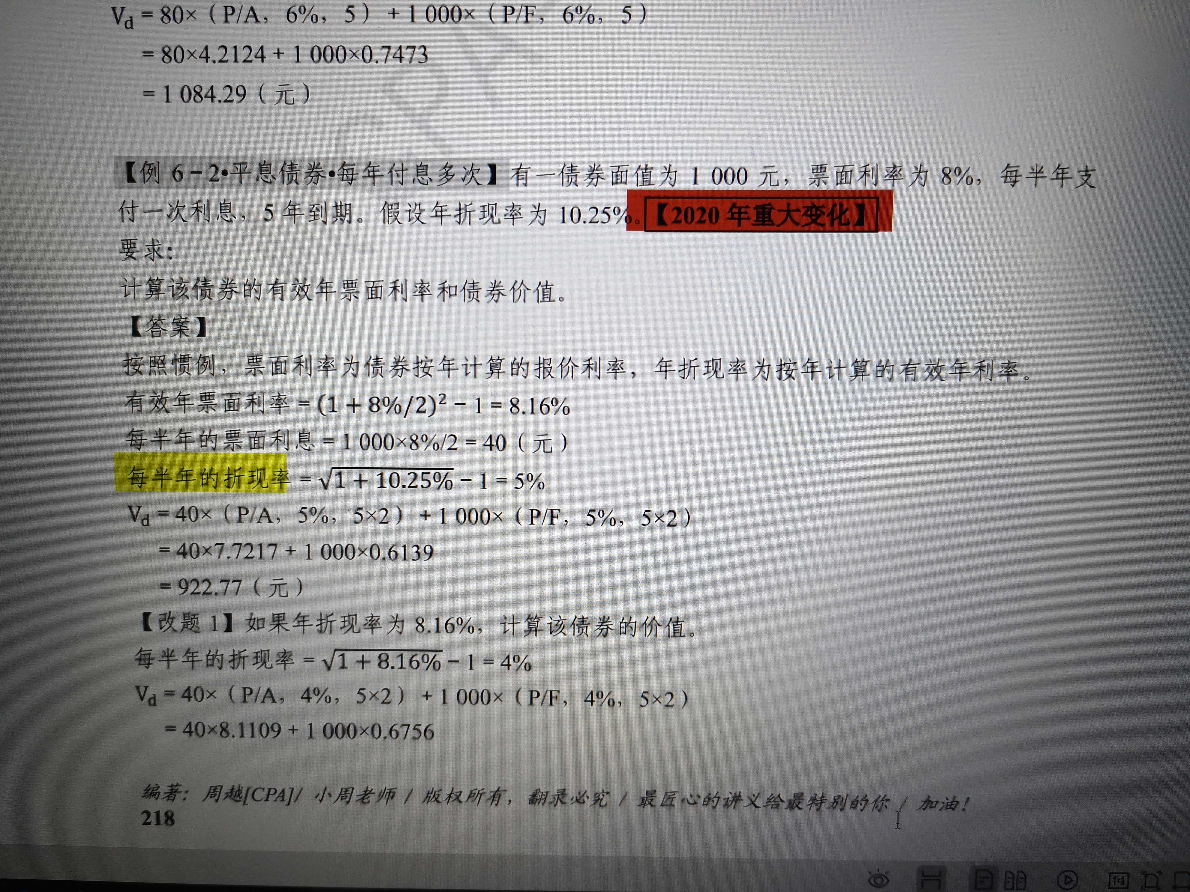 有的题目,只给了报价利率,没有给年折现率,这是老题目,这时候默认半年计息期利率=有效半年折现率。如果题目给了报价利率,也给了年折现率,那么就要单独算半年计息期利率、有效半年折现率