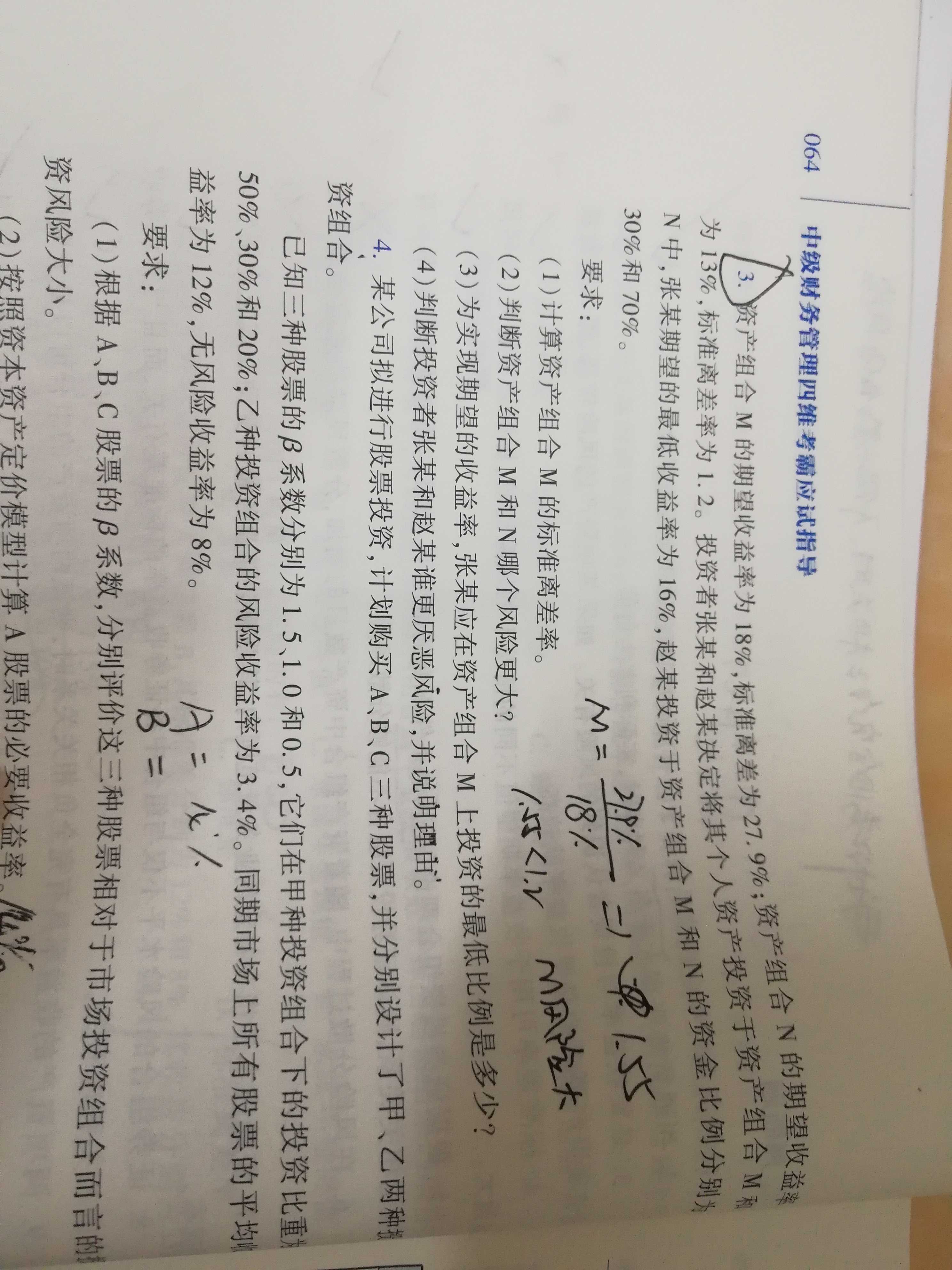 第3问用到公式,组合收益率=M收益率*M比重+N收益率*N比重