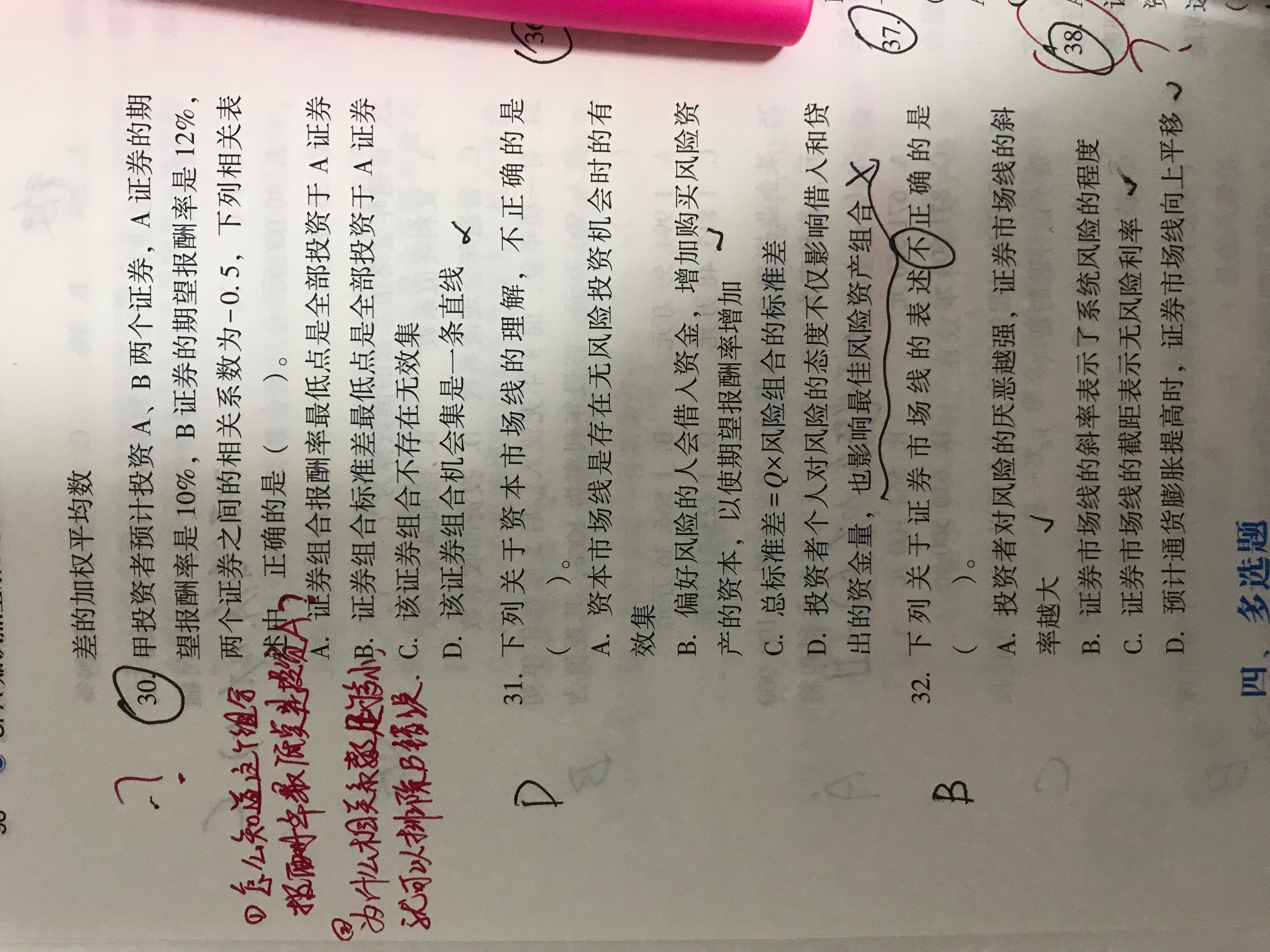 2.因为只要想相关系数足够小,那么投资组合就有分散风险的效果,因此组合的标准差会比投资于单项证券的标准差小,所以组合的标准差会小于AB各自的标准差。