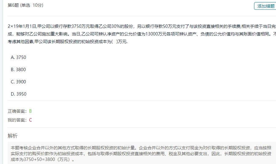 这题考的是权益法下长投的初始成本的核算哦,是按照支付的公允对价+相关税费确认为初始投资成本。同一控制下的成本法长投核算,才是按照被合并方净资产在最终控制方合报中账面价值的份额+(商誉)确认为初始投资成本。希望老师的解答能帮助你理解!同学继续加油呀~祝同学逢考必过~