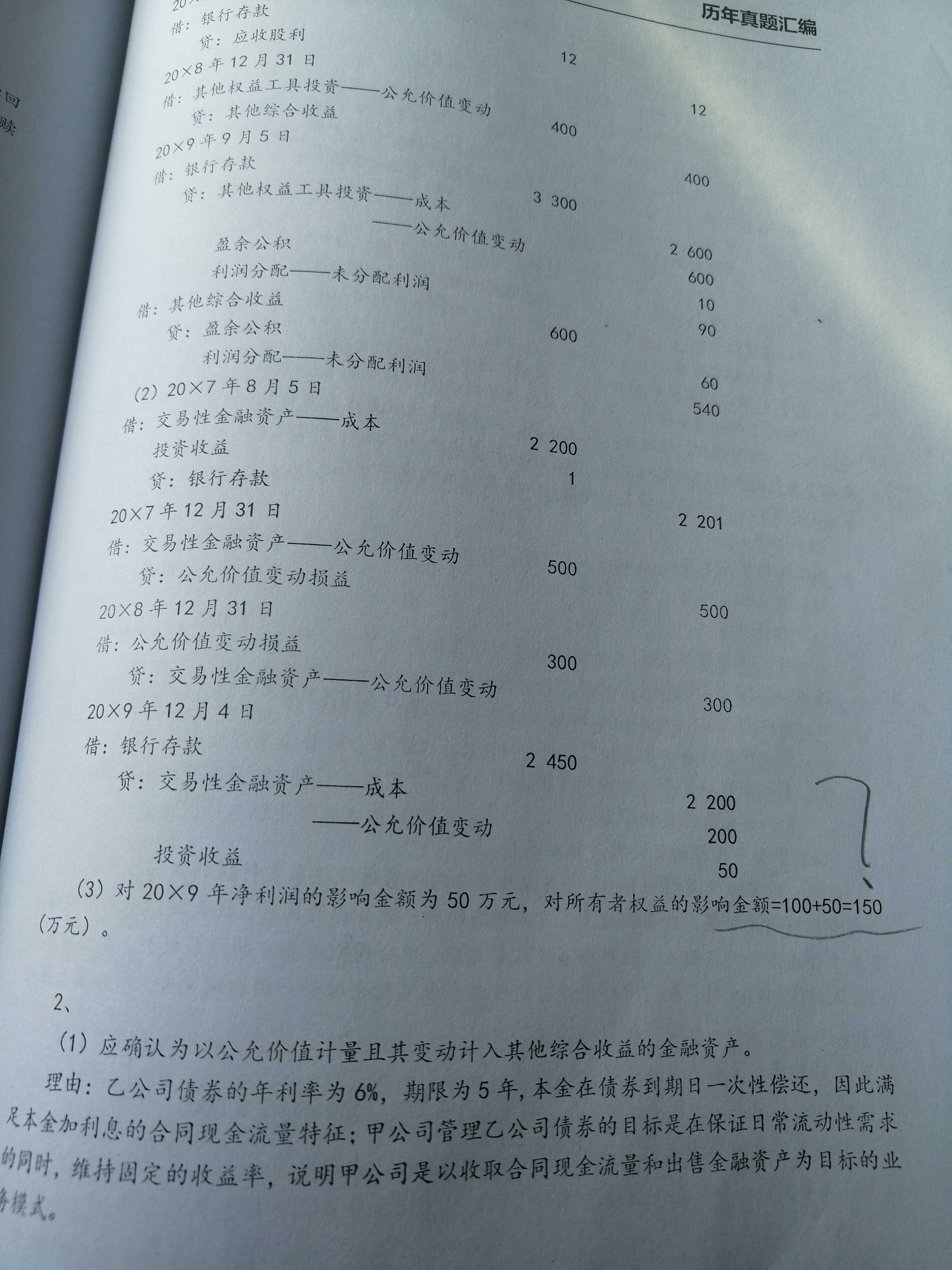 其他债权工具投资2019年确认了所有者权益100万元,交易性金融资产2019年确认了50万元投资收益,最终也会结转计入所有者权益。所以合计影响所有者权益150万元。