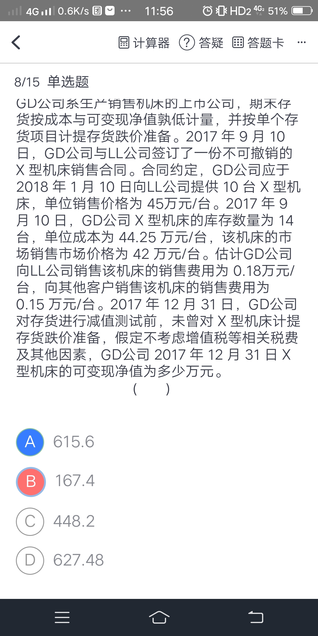 同学第一张图片中算的没错啊,有合同的可变现净值是448.2,无合同的可变现净值是167.4,所以X 型机床的可变现净值448.2+167.4=615.6