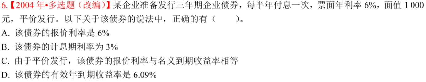 老师,这道题的C选项,不平价发行报价利率也等于名义到期收益率吧?