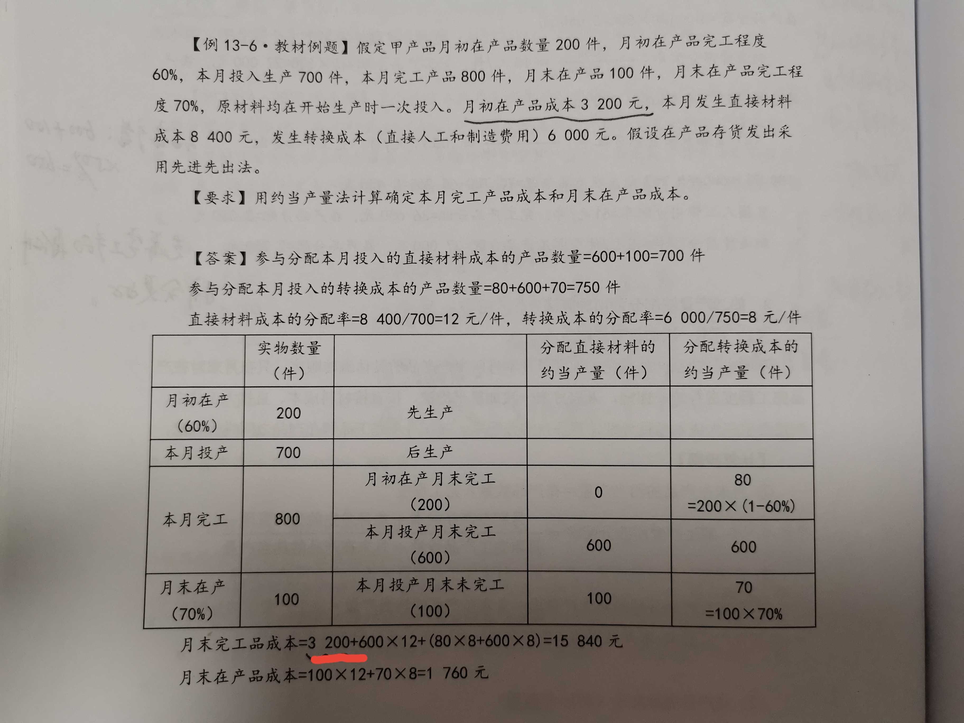 月末完工品成本,为什么还要加上月初产品成本3200?这3200不是应该在上个月被算成上个月在产品约当产量后并计入了上个月的成本吗?