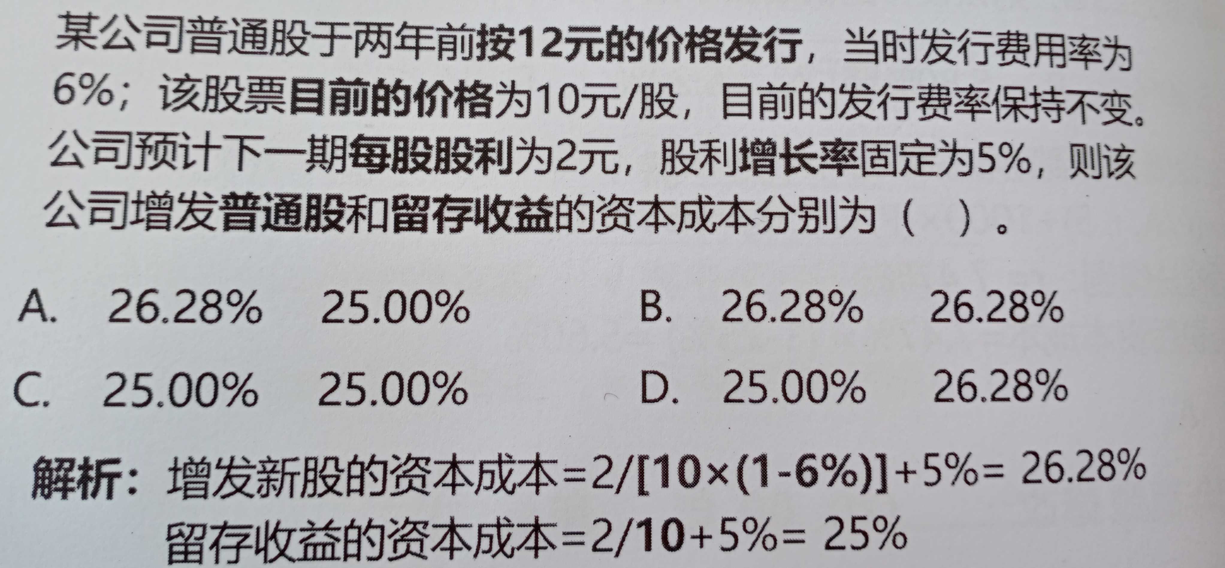 这里考查的知识点是用资本成本的计算哈~首先股权的资本成本这里用了股利增长模型来计算的,股利增长模型的公式:R股权=D1/P0(1-f)+g;