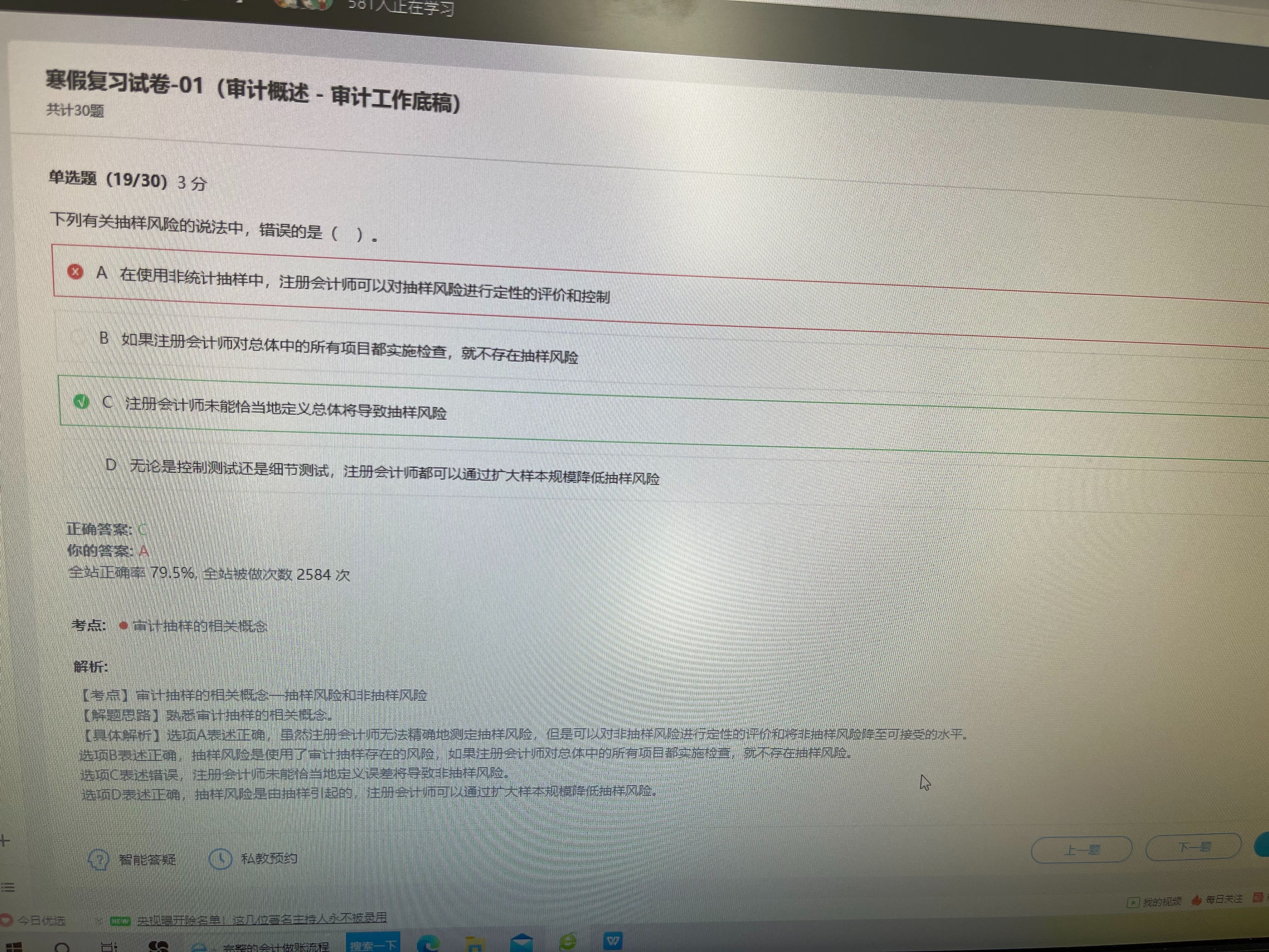 注册会计师未能恰当的定义总体这是在实施抽样之前的事项,所以属于非抽样风险。