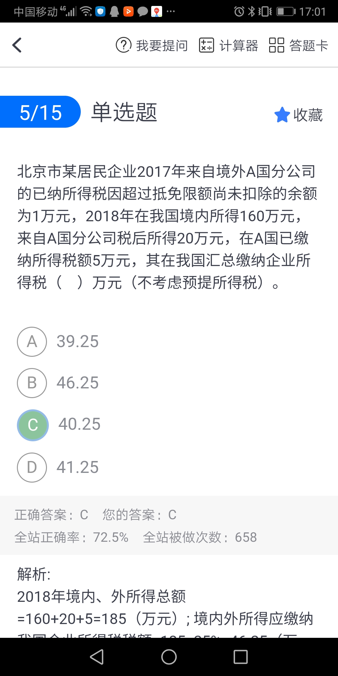 这里是这样的,问我们在我国缴纳多少的企业所得税,,首先这个160肯定是要我们国家交的,所以是160*25%=40.然后看这个20税后所得要还原成税前的,所以是20+5=25在我们国家的一个抵免限额=25*25%=6.25,现在在国外只是缴纳了5.说明要在我们国家补交1.25,但是题目还说了有一个上年的抵免限额1万元,所以还要减去1的,相当于补交0.25。最后加总=40+0.25=40.25