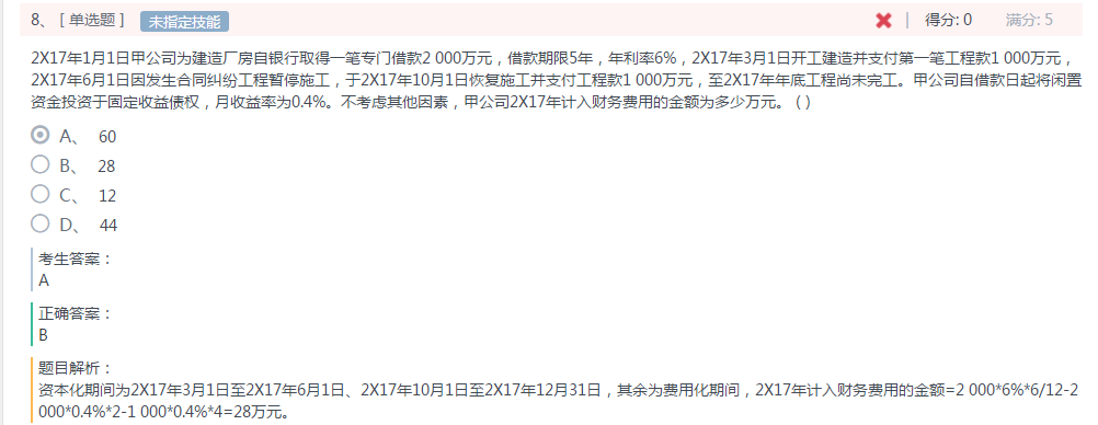 闲置收益不应该是1000*0.4%*7=28,因为从3月份支付了1000万以后,一直到10月才支付的另外1000万,不是应该按7个月算么?为什么资本化的期间3月到6月就不算闲置收益了呢?