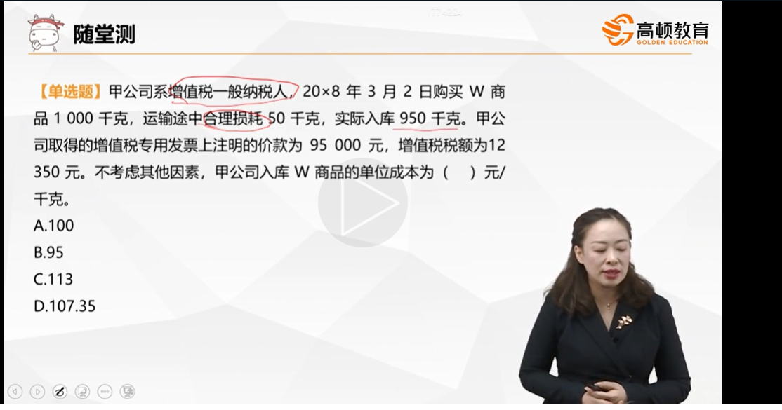 非合理损耗损失计入损益。 总成本=95000-损失部分如有疑问欢迎继续提问~ 加油呀~