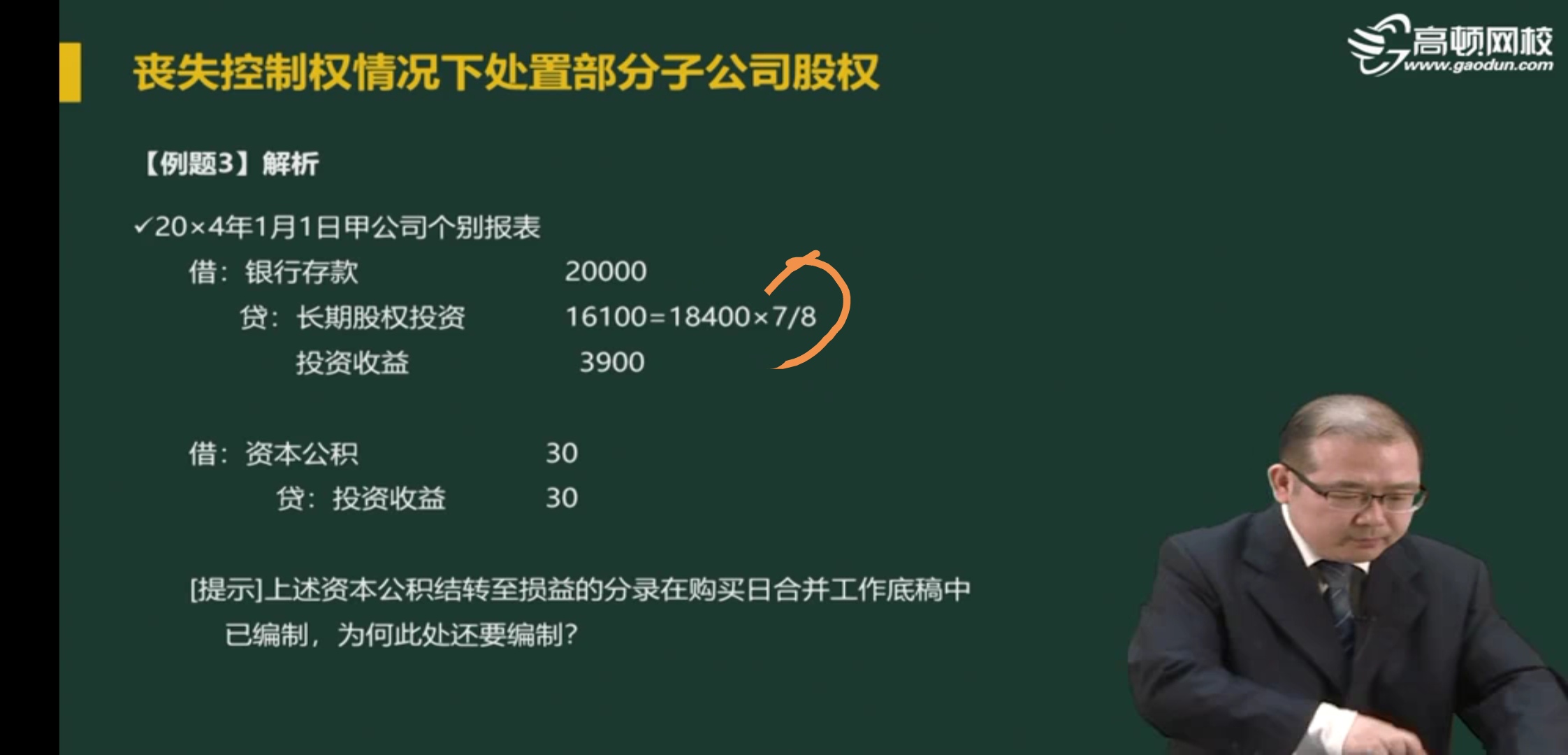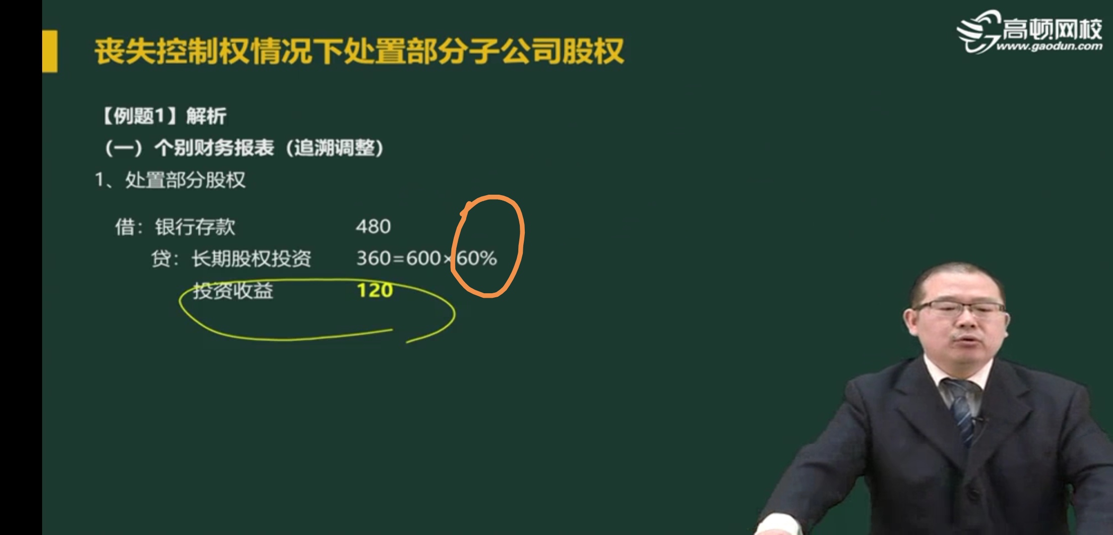 老师,第一个图题里说出售了股权的60%为什么直接乘60%?而二个图里不是直接乘,80%股权出售了70%而是8分之7也就是56%,这两个明显算法不一样啊?应该怎么算
