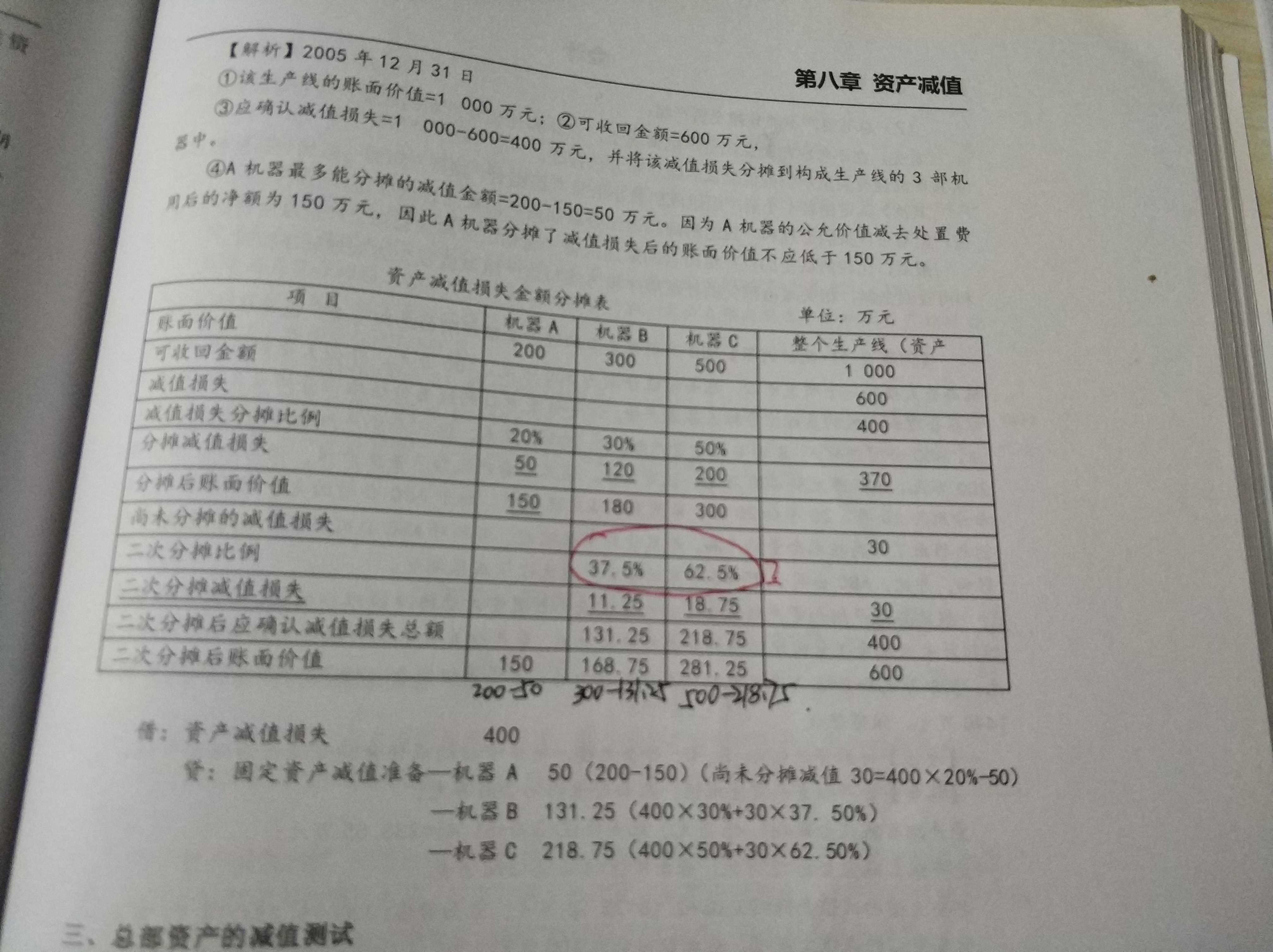 第一次分摊后机器B账面价值是180,机器C账面价值是300;