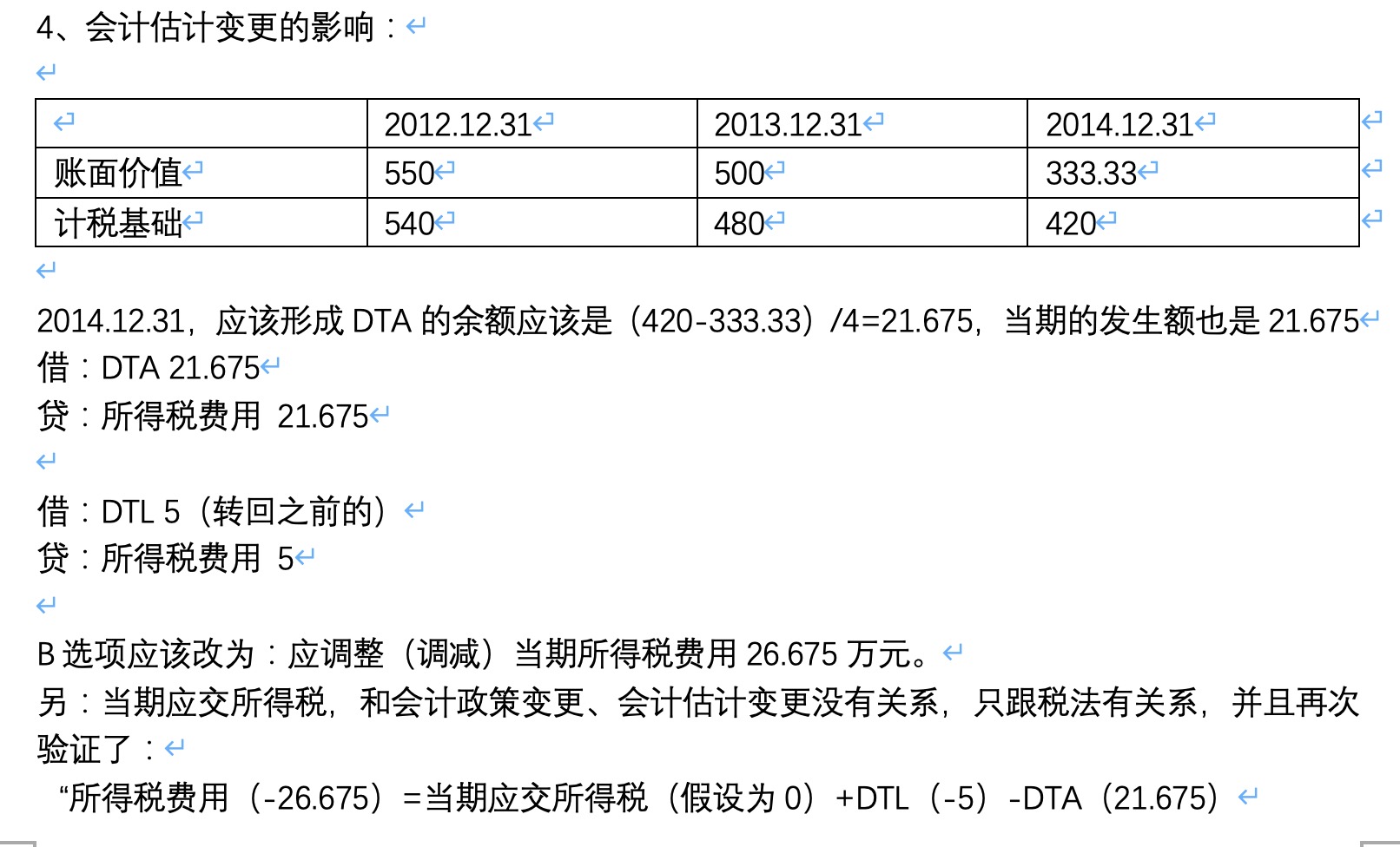 老师你好,问题如图,问一下这道题会计估计变更的影响,我的理解写在了图片里,如有不对请指出并解释。