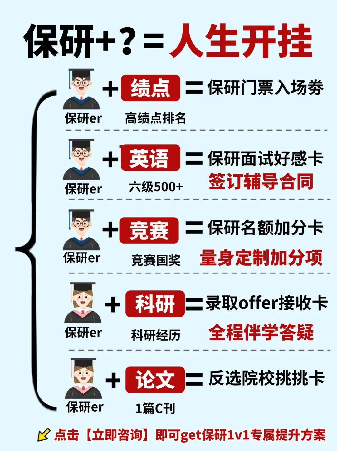 3.服务内容:涵盖规划伴学、绩点提升、英语提升、科研论文、竞赛辅导、推免辅导等保研全流程,致力于帮助学员圆梦名校。
