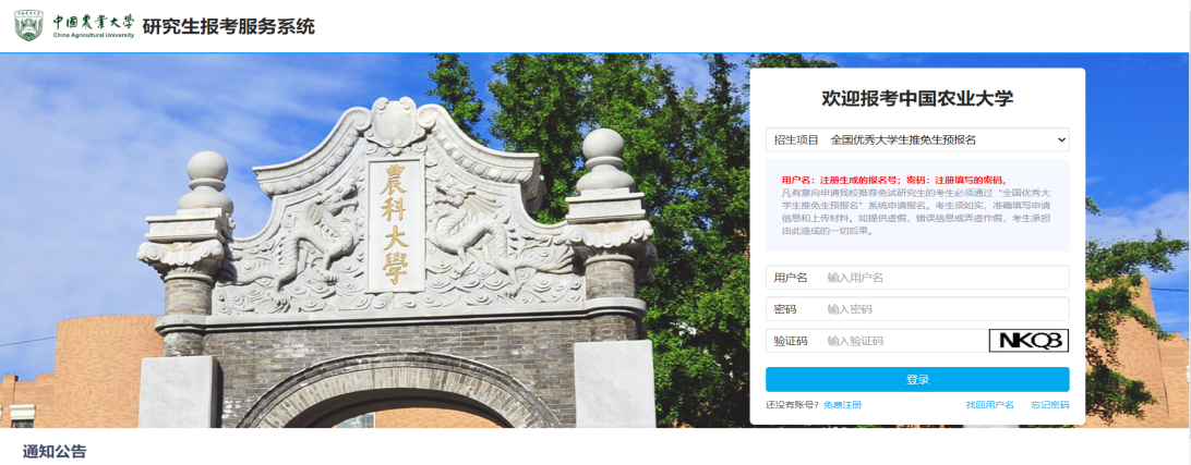 学校系统使用说明:考生登录网址:https://yzk.cau.edu.cn;招生项目选择:中国农业大学接收推免生报名(请使用Windows系统、360浏览器,登录界面如下图);考生首次登录请选择“免费注册”,按要求完成注册即可登录报名。特别提示:每位考生只能注册一次。