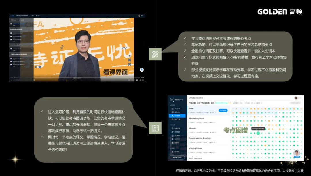 还会把CFA那些又多又杂的知识点梳理得清清楚楚,重点难点一目了然,内容也完全跟着最新考纲走,省去你自己整理考点的大量时间。