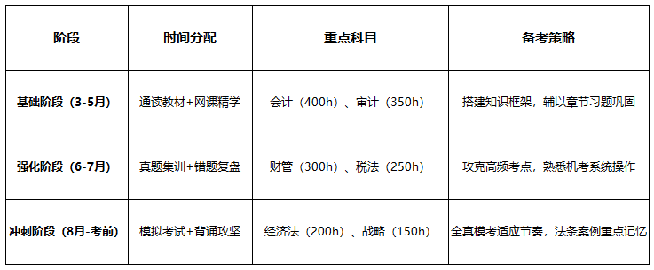 根据cpa科目难度与知识点特性,建议日均学习时长不低于3小时,分阶段推进: