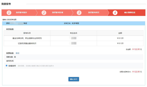 6、确认报考信息;(基金预约式考试报考成功后机位将保留120分钟,请在120分钟内完成支付操作。基金从业统考报考成功后机位将保留至报名截止,请在截至日前完成缴费。)