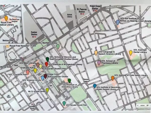 UCL是一个开放式的大学,没有围墙,没有大门,众多建筑遍布整个伦敦。学校主要部分在伦敦中心的Bloomsbury,号称头顶大英图书馆,脚踩大英博物馆。学校周围有5个步行可到达的地铁站,2个火车站。这得天独厚的地理优势和学术优势,全世界应该没有几所大学能媲美。