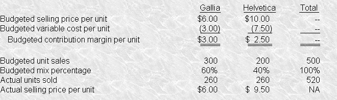 Answer (B) is correct . The sales mix variance in Gallia is $156 U {[260 actual units sold – (520 actual total units sold × .6 budgeted percentage)] × $3 budgeted UCM}. The sales mix variance in Helvetica is $130 F {[260 actual units sold – (520 actual total units sold × .4 budgeted percentage)] × $2.50 budgeted UCM}. Thus, the multiple-country sales mix variance is $26 U ($156 U – $130 F).