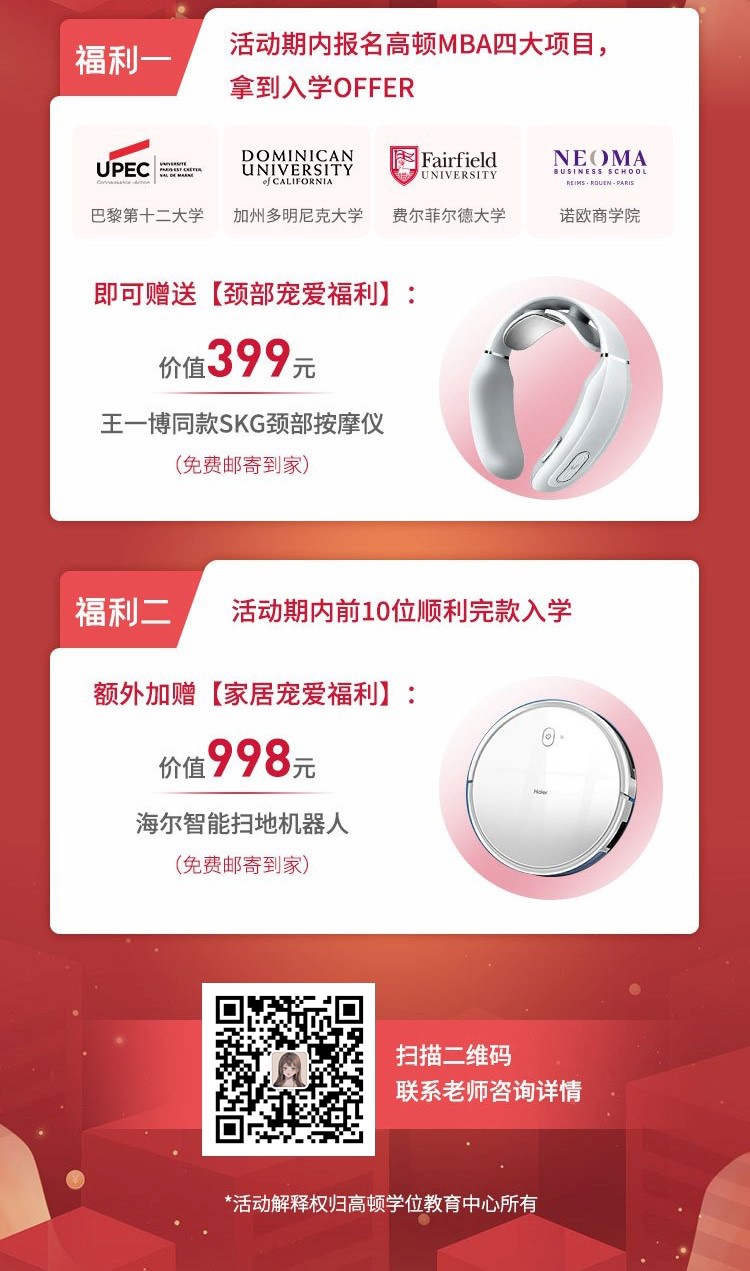 5月1日—5月28日成功报名高顿学位教育中心任一项目,获得offer并结交完款的前10位同学,就可以获得海尔智能扫地机器人,让做家务的你解放双手。