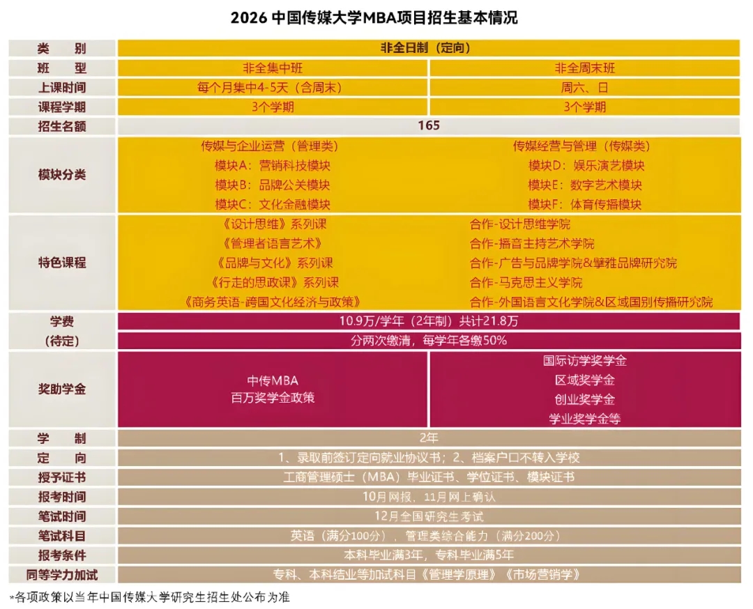 2023-08-252024年中国传媒大学MBA招生简章目前还没有发布,小编整理的2024年的招生信息,大家可以作为参考,其中招生条件、报考流程、学制等信息基本不会发生变化,有报考意向的同学要仔细阅读哦~...