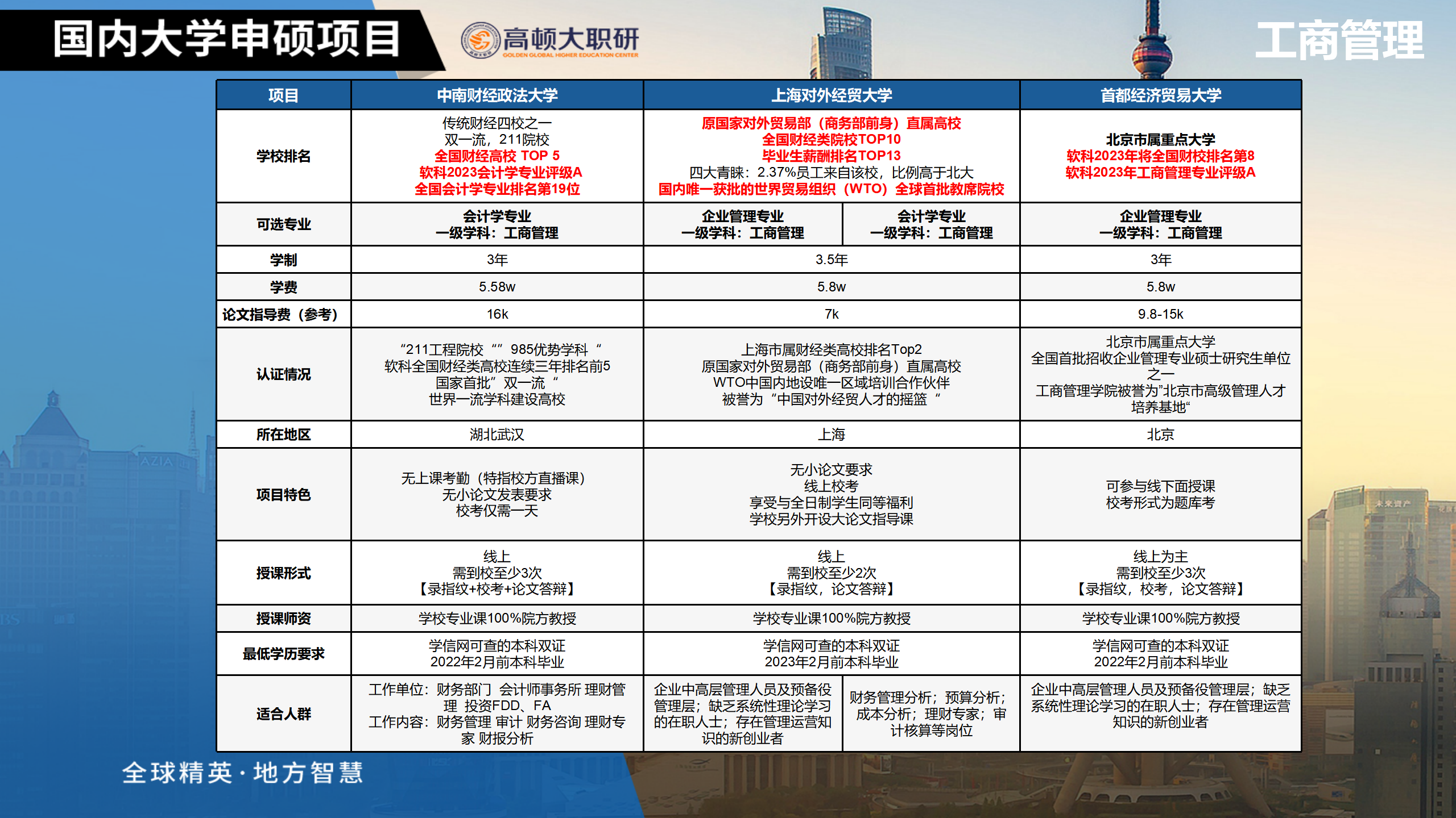 工商管理、法律、公共管理、工程管理、教育管理、艺术设计学、美术学、高级工商管理(EMBA) |