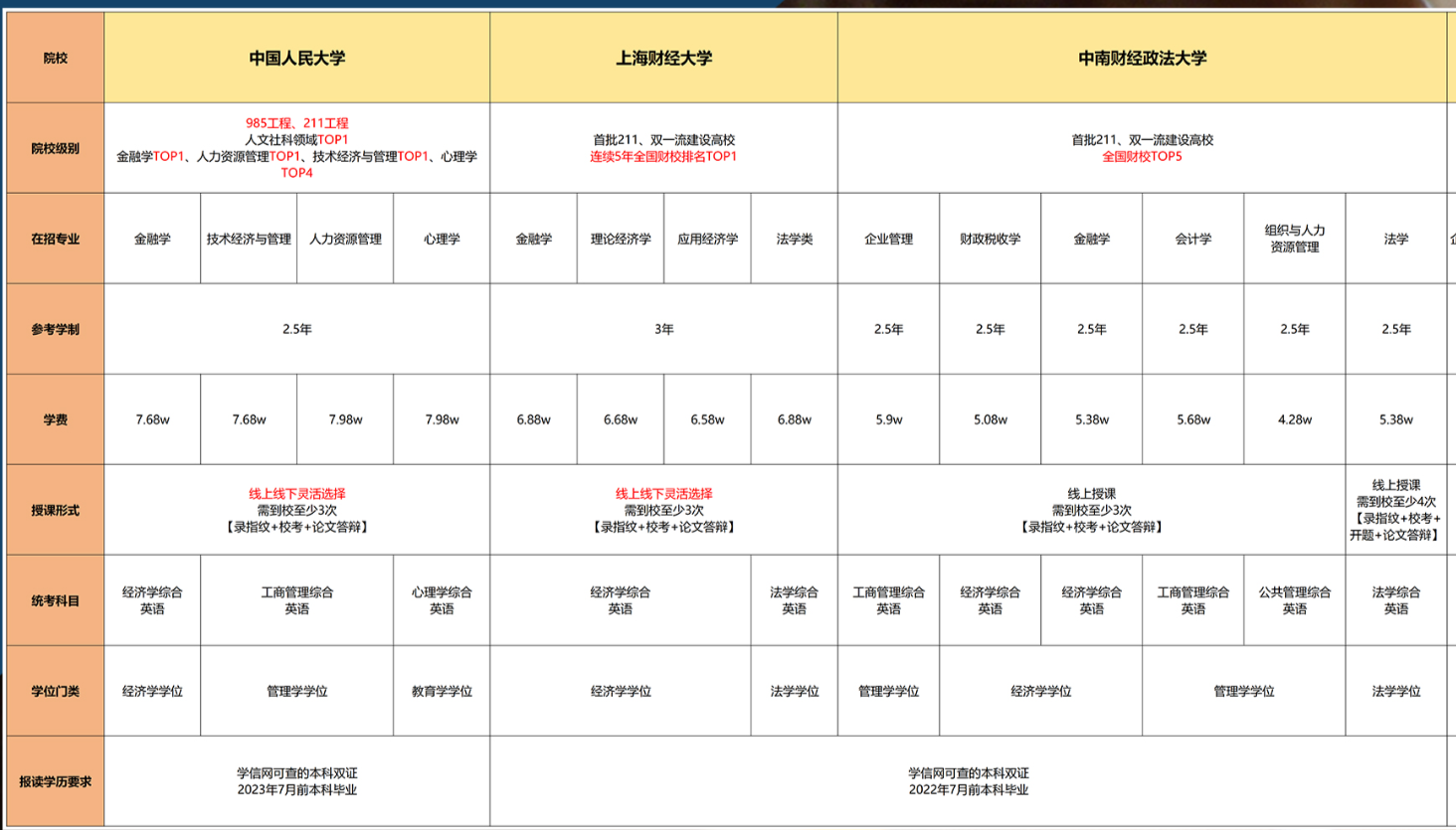 | 上课地点 | 中国人民大学校内 | 北京国家会计学院校内 | 对外经济贸易大学校内 | 北京/上海2地办学 | 北京/上海2地办学 | 上海/青岛2地办学 | 上海异地办学 | 香港中文大学深圳校区 | 广州/深圳2地办学 | 香港城市大学校内 | 电子科技大学校内 |