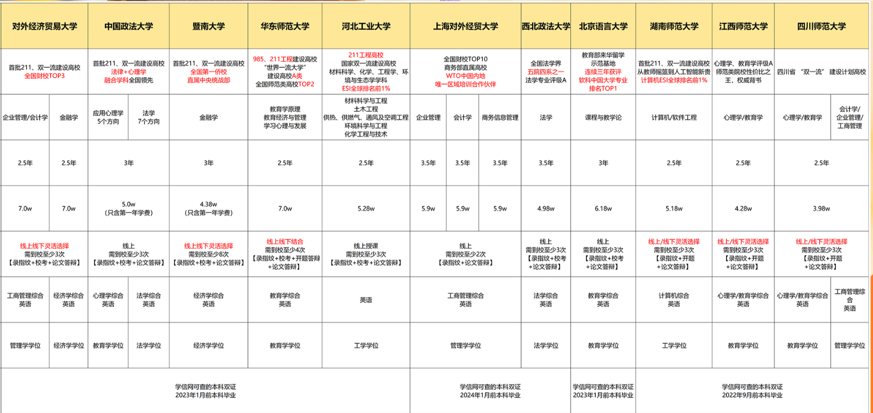 | 学制 | 1年 | 2年 | 2年 | 1.5年 | 14个月 | 2年 | 2年 | 2年 | 2年 | 2年 | 2年 |