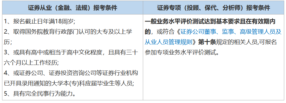 一般来说,年满18周岁,取得大专(或高中+36个月从业经历,或应届实习生)学历即可报名证券从业资格考试,通过证券从业考试即可报考证券专项考试,详情如下: