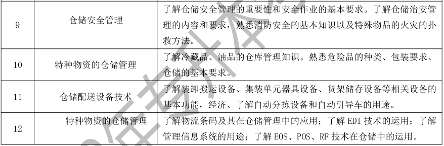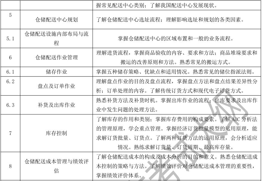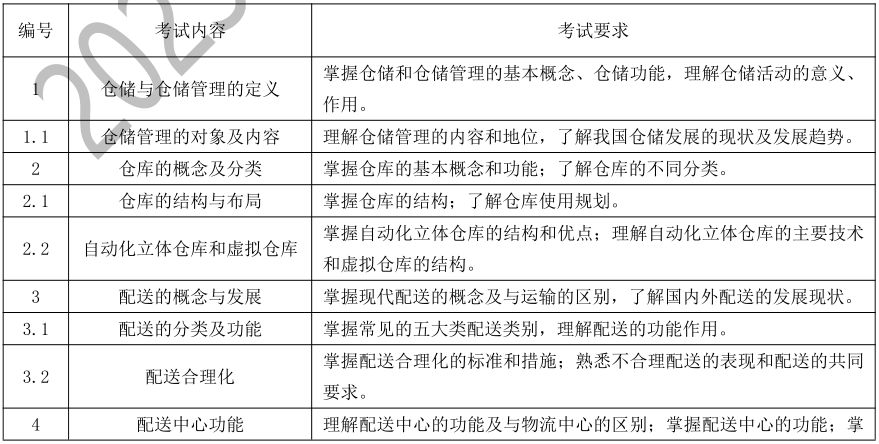 要求考生系统地理解《仓储与配送管理》课程的基本概念、基本理论,掌握仓储与配送管理的基础知识、仓库规划与布局、仓储作业和库存管理、仓储安全、特种物资仓储管理、仓储机械设施、仓储与配送信息技术的基本方法。要求考生具有理解仓储、仓储管理及物流配送的基本概念及功能,掌握仓储作业、配送中心运作的具体操作过程及现代化仓储配送管理技术,掌握各类仓储与配送设施,培养学生掌握仓储与配送过程中涉及的各类具体作业的操作等能力和综合运用所学知识分析和解决问题的能力,能达到本科阶段学习所需要的素质、知识和能力基本要求。