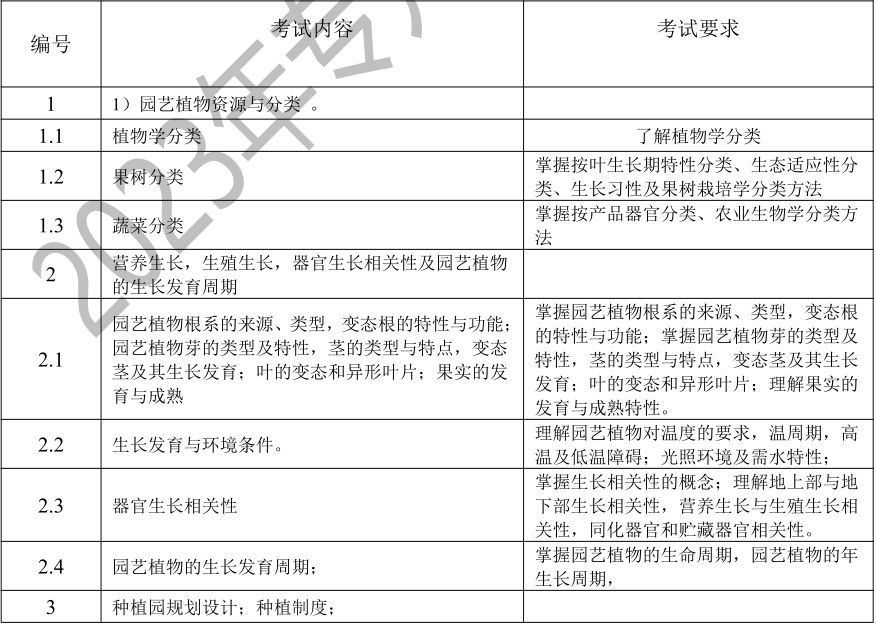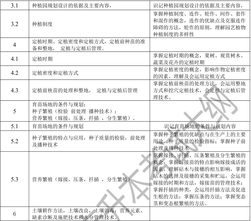 要求考生系统地理解园艺植物栽培学课程的基本概念、基本理论,掌握园艺植物的栽培管理技术。要求考生具有对园艺植物生长发育规律、园艺植物的繁殖、种植园的规划设计和种植制度、栽培技术运用等能力和综合运用所学知识分析和解决问题的能力,能达到本科阶段学习所需要的素质、知识和能力基本要求。