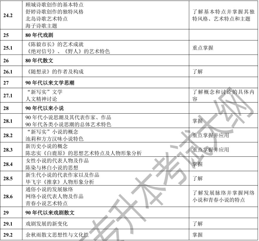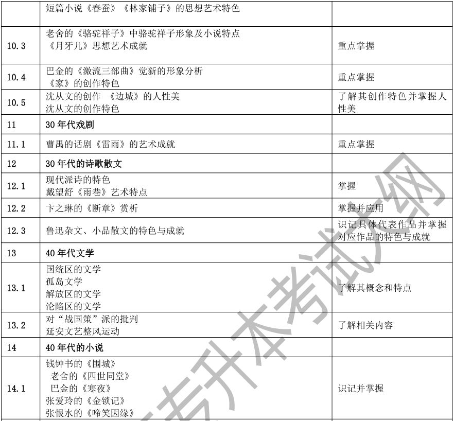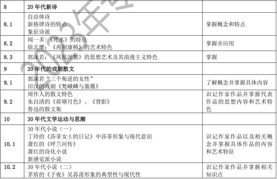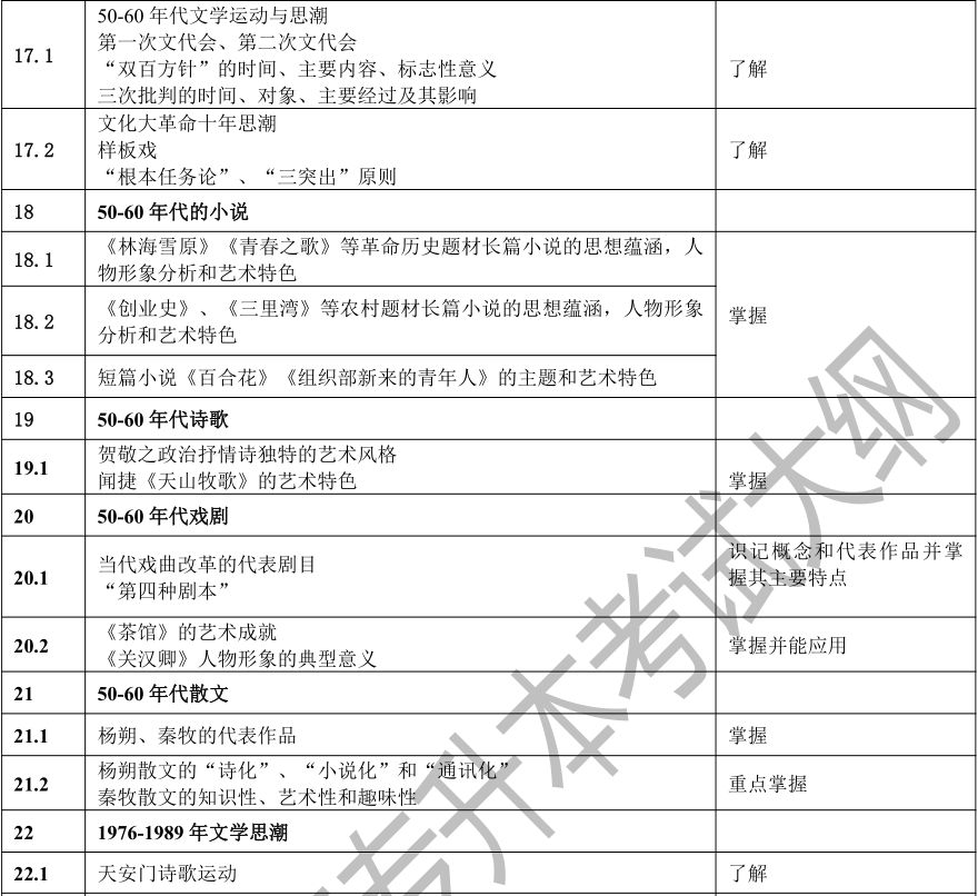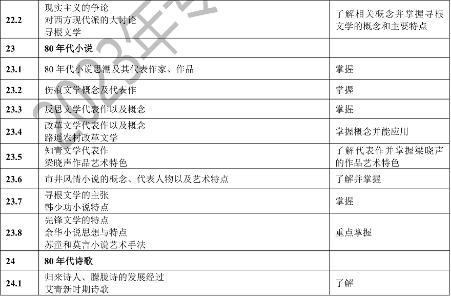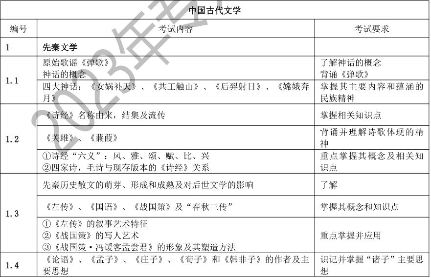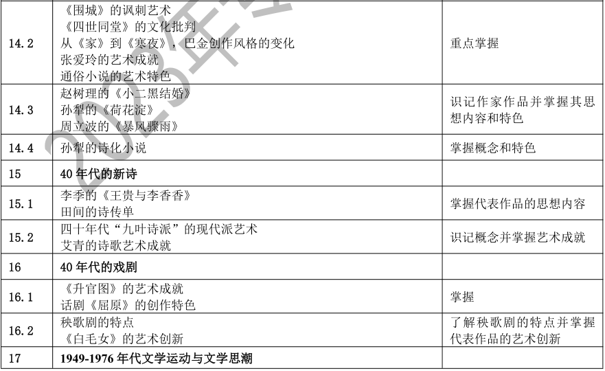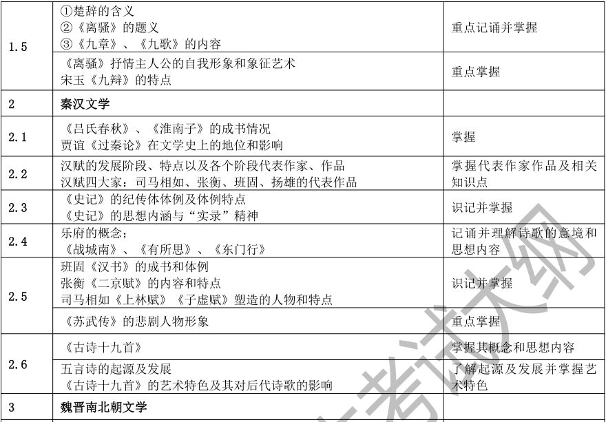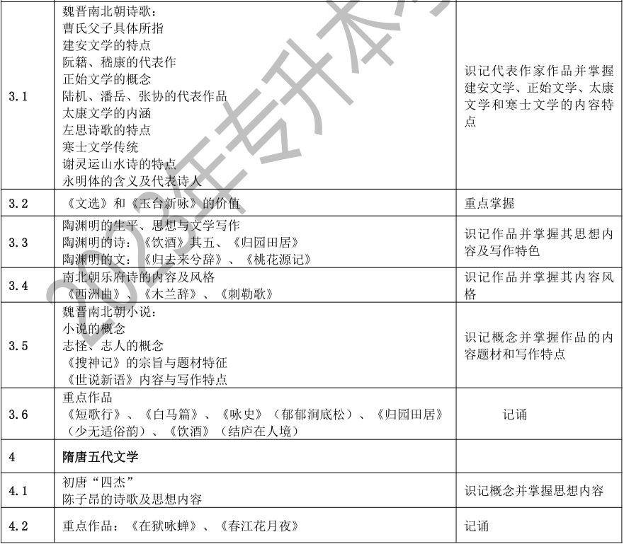 要求考生系统地了解中国文学的发展脉络,了解中国文学史上重要的作家、作品、文学思潮、文学流派、突出的文学现象等,以及其在文学史上的地位和影响。考生应该具有对代表作品的阅读、理解、分析和评价能力,并能够诵记名篇名句,达到本科阶段学习所需要的素质、知识和能力基本要求。